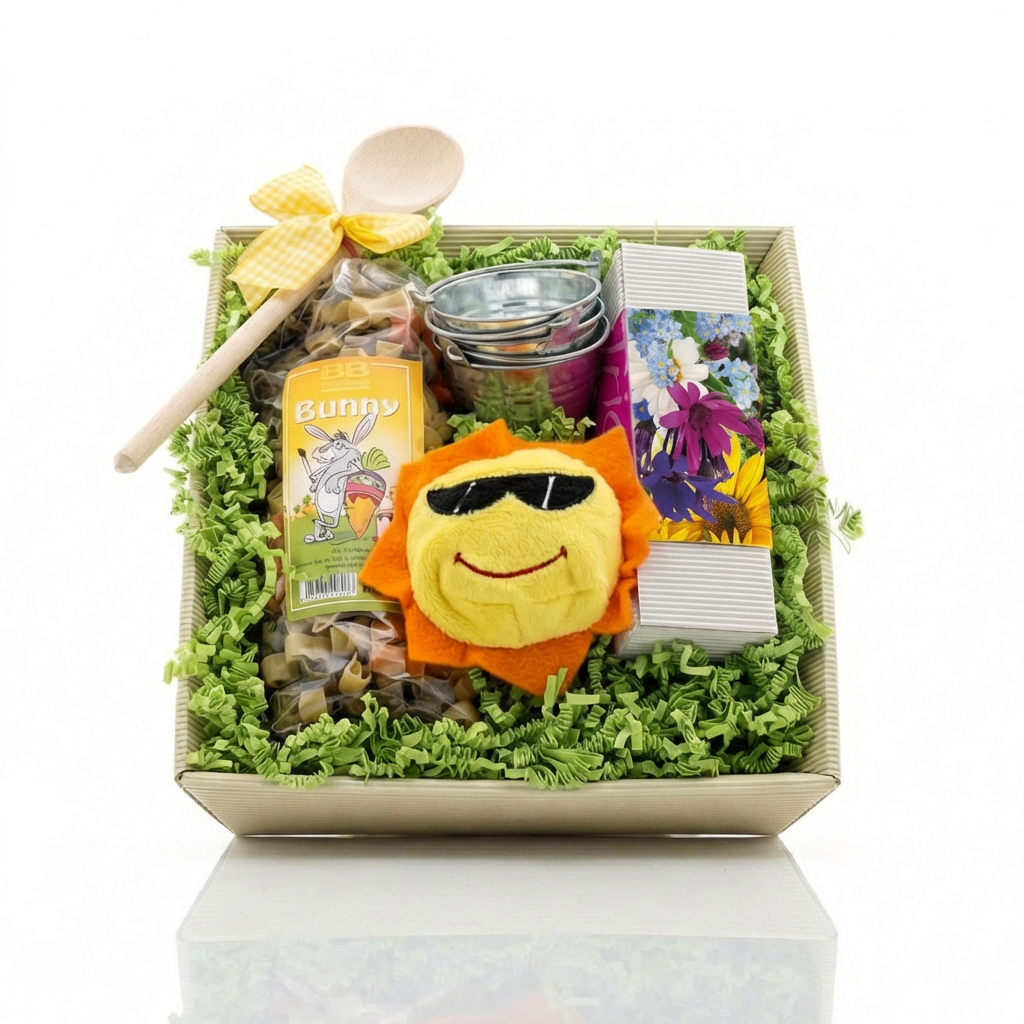 Dieser Korb vereint Genuss mit Wachstum. Sofortige Freude durch einen Lindt Goldhasen und bunte Pasta Bunny. Dauerhafte Begleitung durch drei Pflanzsets, die über Monate hinweg gedeihen.