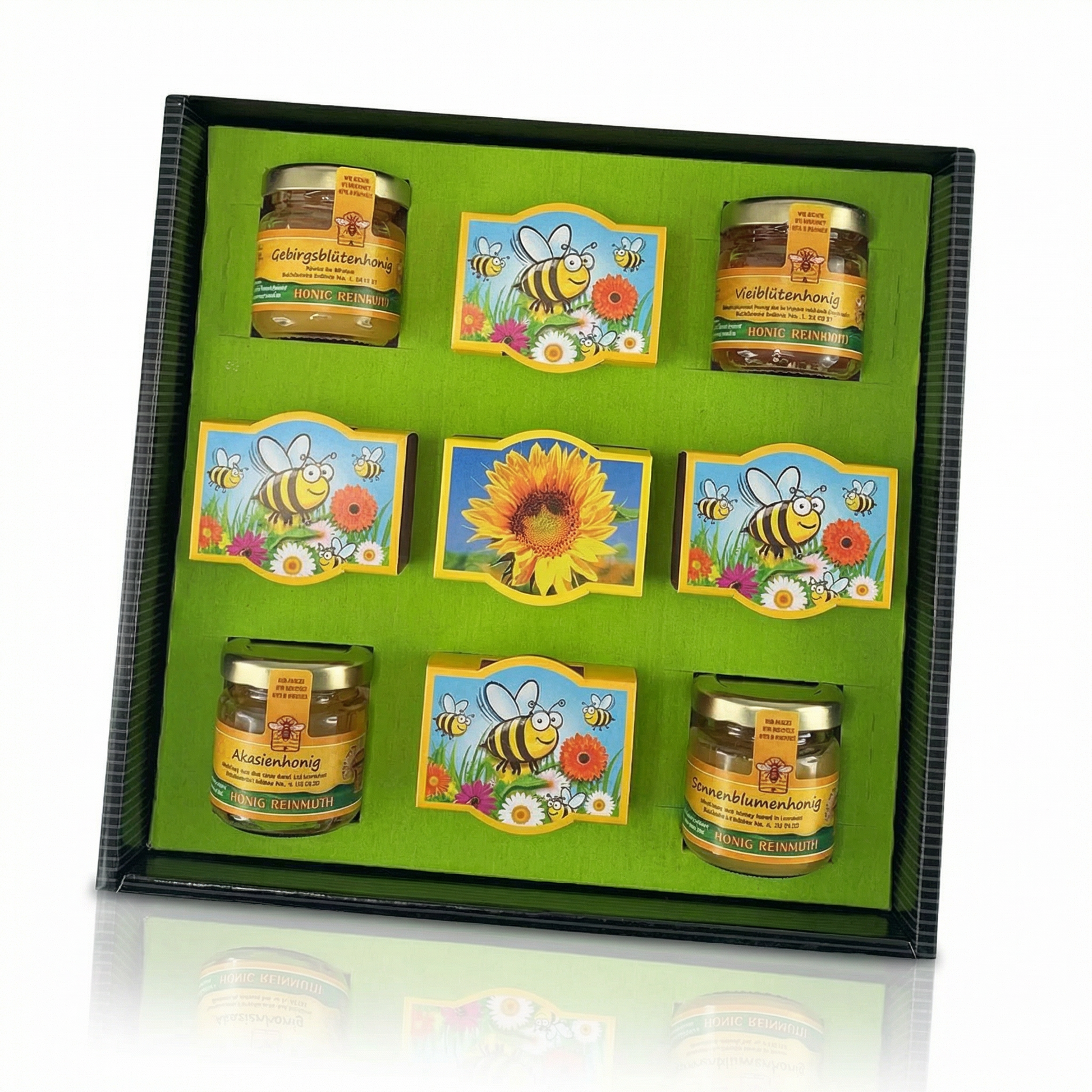 Eine Box, die aufgeht wie ein Frühlingstag. Vier Honigsorten, die zeigen, wie unterschiedlich Bienen denken können – von mild bis würzig, von zart bis charaktervoll. Dazu Mini-Pflanzsets, aus denen Zwergsonnenblumen und bunte Honigwiesen wachsen, wenn man ihnen ein bisschen Zeit und Erde gibt.